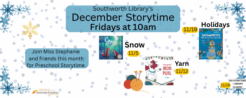 Read moreCome to the Southworth Library on Saturday, December 6th, for holiday fun! Everyone who comes to the library from 10am-2pm