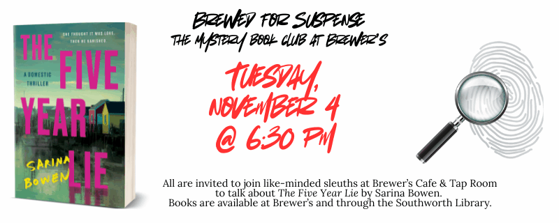 Brewed for Suspense is our mystery book club that meets at Brewer’s Kitchen and Taproom. All are invited to join