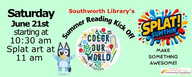 Southworth Library's Summer Reading Kick Off! Saturday June 21st starting at 10:30 am Splat art at 11 am With Splat Sumthin' Paint Room Make Something Aweosme! The image features a green background with a picture of Bluey.